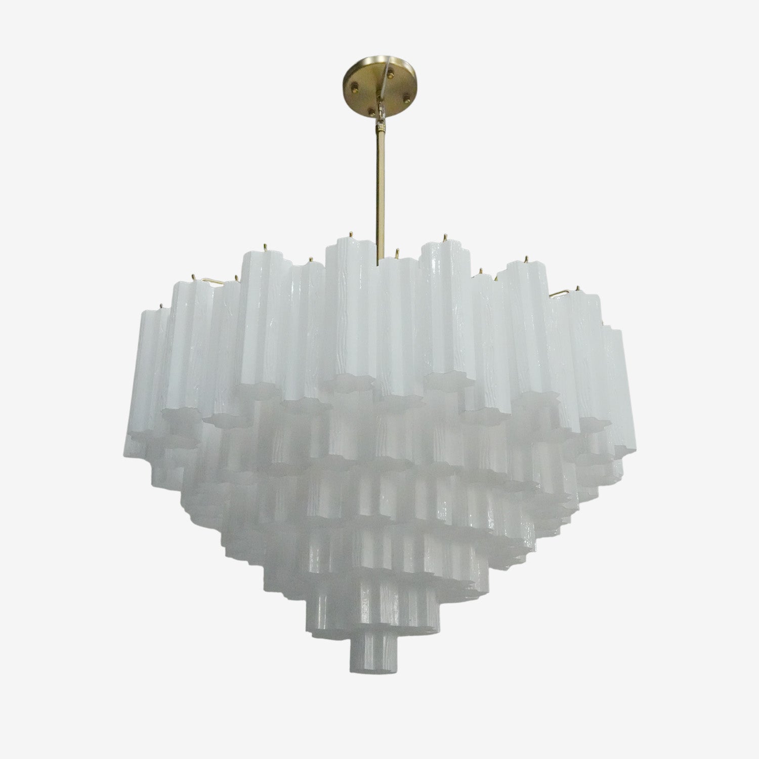 Elevate your space with this exquisite Murano-inspired chandelier, where delicately crafted tubular glass pieces cascade in elegant, multi-tiered layers. Each hand-shaped element captures and refracts light, creating a mesmerizing play of brilliance and shadow. The luminous white glass, with its pristine clarity, strikes a striking contrast against sleek nickel accents, blending modern sophistication with timeless artistry. Perfect for adding a touch of opulence to contemporary or classic interiors, this piece embodies refined luxury and masterful craftsmanship.